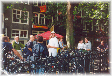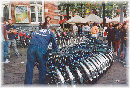 André (blue) locking all the bikes together so we can go have a drink. |